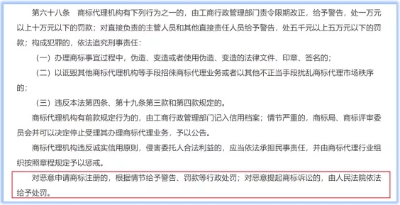 《商标法》第六十八条规定:“对恶意申请商标注册的,根据情节给予警告、罚款等行政处罚;对恶意提起商标诉讼的,由人民法院依法给予处罚。”