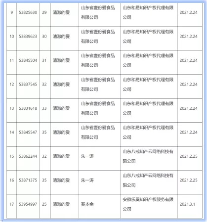 国家知识产权局3月15日发布的《关于依法驳回“清澈的爱”等17件商标注册申请的通告》,同时公布了驳回名单,列明恶意注册申请人名称、代理机构名称及申请注册时间和类别。