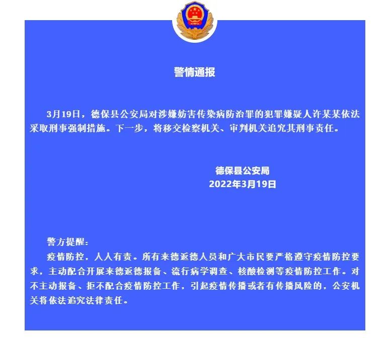记者从广西壮族自治区百色市德保县公安局获悉,3月19日,德保县公安局对涉嫌妨害传染病防治罪的犯罪嫌疑人许某某依法采取刑事强制措施。下一步,这起案件将移交检察机关、审判机关进行进一步处理。